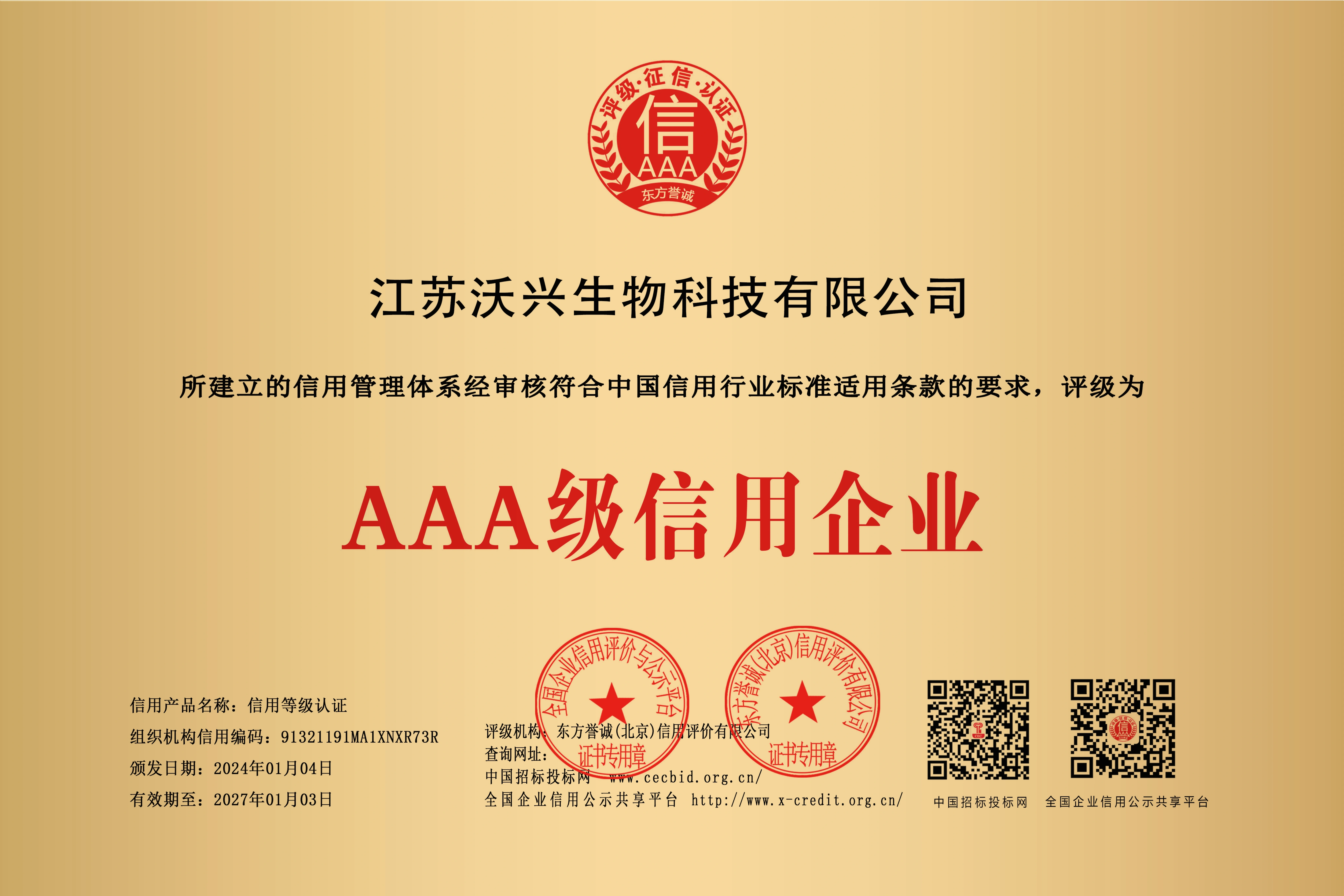 近日,江苏沃兴生物科技有限公司荣获著名信用评级机构颁发的“AAA企业信用等级证书”。此次获得3A级企业认证,标志着沃兴生物自身实力和信誉度的提升,进一步增强了“沃兴”品牌的市场竞争力。